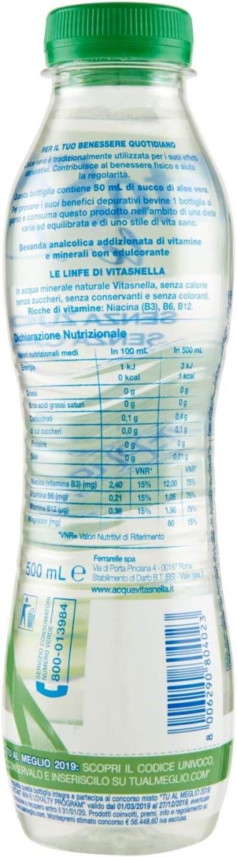 Ingredienti : Acqua minerale naturale Vitasnella;Succo di aloe vera (10%) da liofilizzato;Acidificante: acido citrico;Potassio fosfato;Magnesio carbonato;Aromi;Niacina (vitamina B3);Vitamina B6;Vitamina B12;Edulcorante: acesulfame K